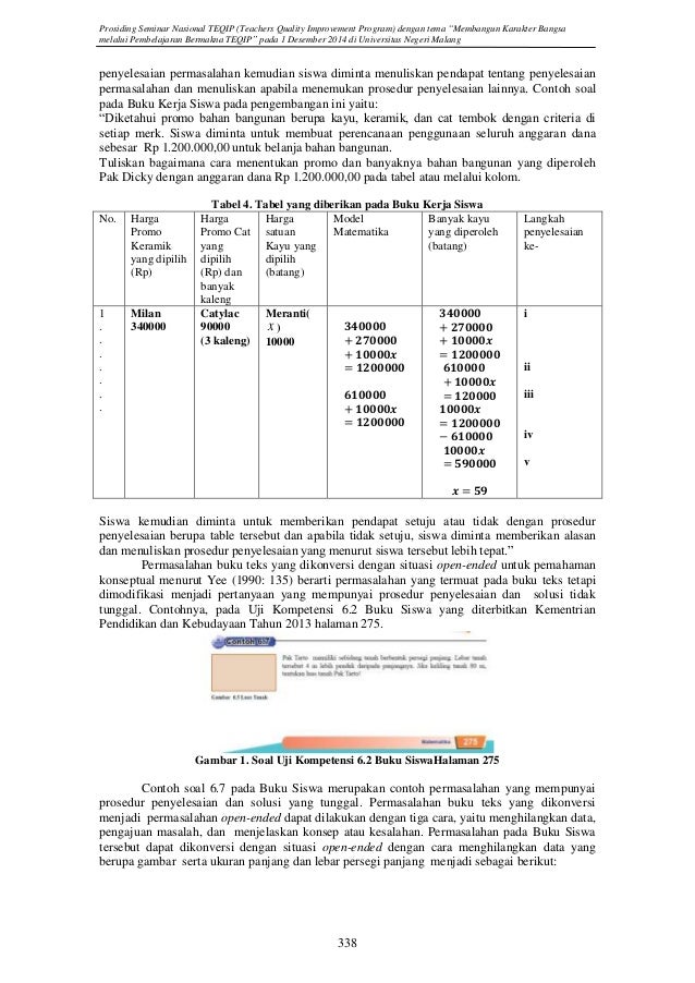 Belajar dari rumah temukan bilangan desimal di sekitarmu jawaban soal matematika tema 3 kelas 4 sd mi halaman 13 14 berikut kami tampilkan ulasan pembahasan soal dan jawaban dari pertanyaan di buku tematik terpadu kurikulum 2013. Soal jenis ini memberikan kesempatan untuk memberikan jawaban atau solusi yang beragam atau memberikan kesempatan untuk menggunakan beberapa cara guna menemukan jawaban yang benar. Pada soal ini masalah dirumuskan sedemikian rupa sehingga menuntut siswa untuk melakukan investigasi konteks, sebab tidak semua informasi diberikan secara eksplisit. Anda mungkin bisa memperkirakan banyaknya jawaban yang bisa diberikan oleh anak. Ilmu pengetahuan 1 contoh soal open ended matematika smp soal open ended contoh soal open ended matematika smp kelas 8 dunia belajar pembahasan soal open ended timms dan pisa live with mathematics